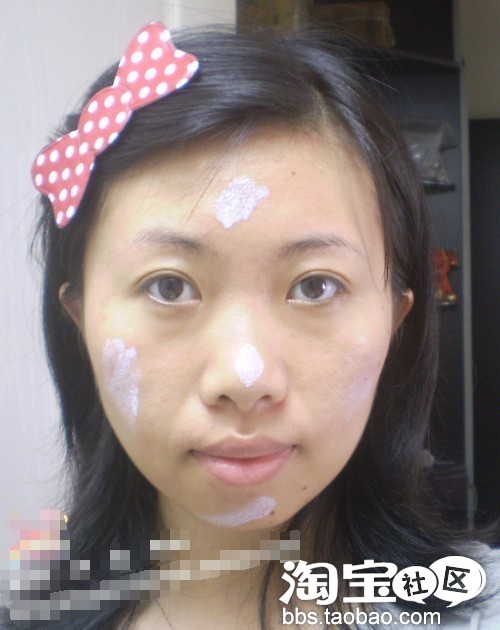1.分五点,均匀的涂上隔离霜后,选用比肤色略浅一号的粉底液;