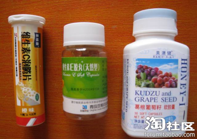 从左到右依次为:维生素C泡腾片、维生素E胶丸和葡萄籽胶囊