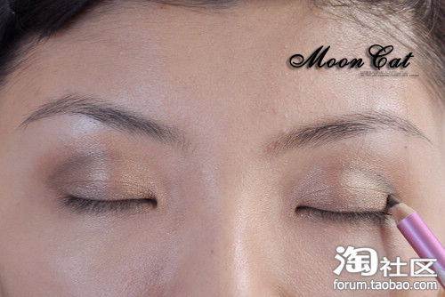 然后用棕色亚光的眼线笔,照着这样子画条线,线的位置就画在自己的双眼线上,我画这么高是因为我一会要贴双眼贴把自己的双眼线抬高的。
