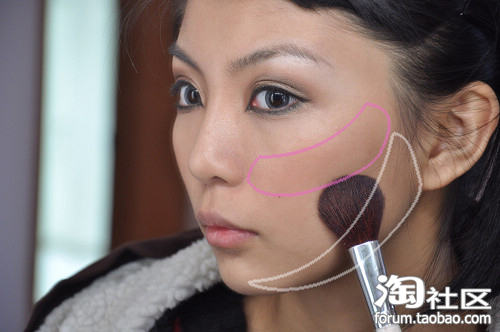 最后是腮红和修颜,腮红用偏棕的暗色系,粉色就别来了~那一点也不反派。 腮红刷在红色框里。修容粉用深咖啡色,刷在白色区域,脸要修得棱角点,我是肉肉脸,可是为什么像带鱼呢 费解。