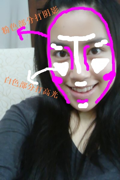 不要被我粗糙的教学图吓到…阴影我用的是组合里最下面的偏淡棕色的,高光是用的中间白色调和左侧淡粉色。本身图里鼻子的部分有些高鼻梁的MM就不用了,自然妆用鼻影有时候会显得脏脏的,不过淡淡的扫过的话也没问题了,tingting本身算高鼻梁,但是还想更深邃的五官啊...