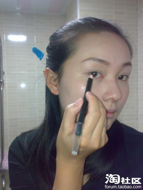 在画眼线。美家的眼线笔真好用,不晕染。。39块