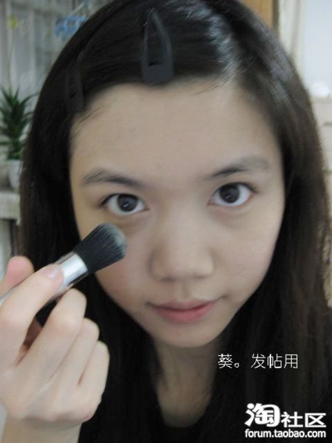 用散粉刷每次沾取少量散粉轻刷面部。这样清透的底妆就完成咯~~哇哈哈。