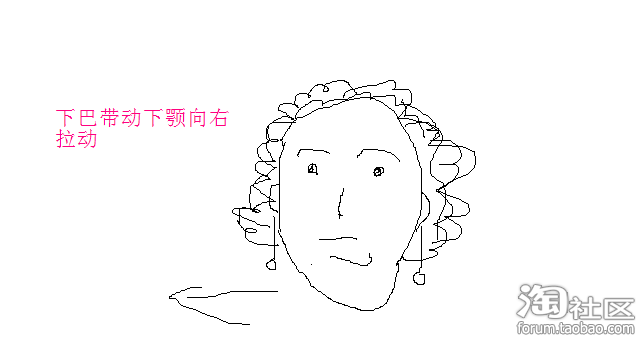 第一步:用下巴用力的带动下颚,往左边拉动。坚持3秒。坚持的过程中一定要拉紧右边脸颊的肌肉哦,如图示: