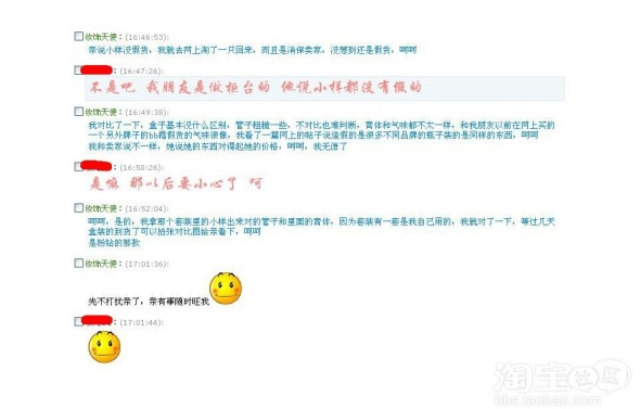 几天后,原来买我们宝贝的买家给我们回评了,我趁她在线,赶紧和她说了一下这个情况,也算给这位善解人意的mm提个醒,以免下次上当买到假货: