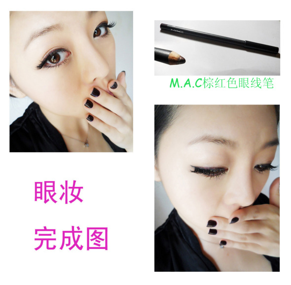如图所示:沿着上假睫毛根部涂化棕红色眼线,打造妩媚双眼,色彩是妆的根本