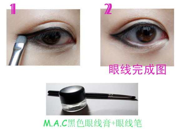 1.沿着睫毛根部顺着眼皮涂化,注意尾部向上拉长,打造细长的眼睛(图1)
