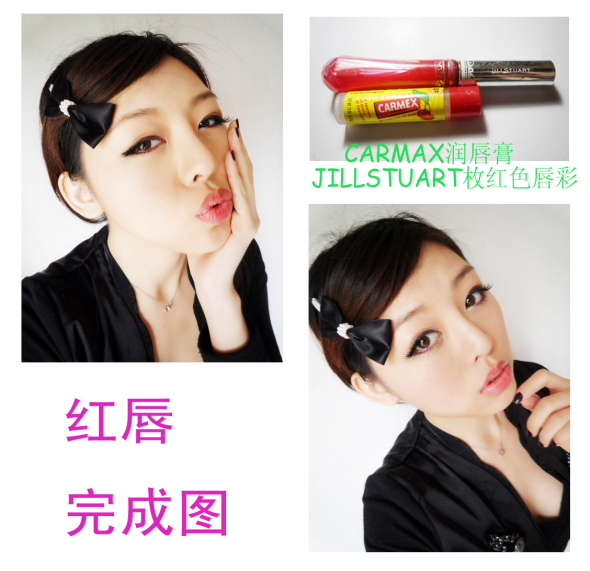 如图所示:先擦润唇膏,再涂抹上枚红色亮亮唇彩