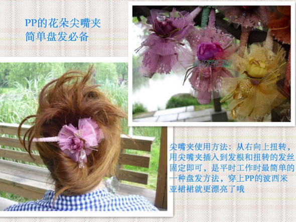 炎热的夏天到了,大家又可以穿上PP的裙子了,呵呵,今年流行的波西米亚长裙,应该配怎样的发型的,猪猪继续推出详细图解第二季,以下是用花朵发饰盘出的法国发髻和中国发髻,看图。。。