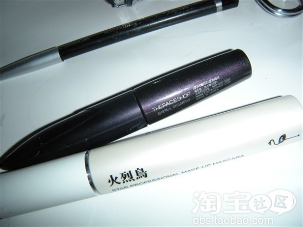 再就是睫毛膏,很平价好用的火烈鸟系列的,我是离不开他了~用完一支又一只~眼线笔不知道啥牌子,不值钱的东西~眼线液是THE FACE SHOP的,我们这有家正品小店,小心假货哦~睫毛夹也是谜尚的,还不错~