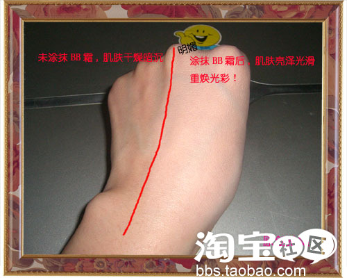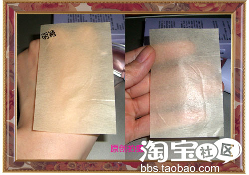 清爽度测试方法:待BB霜吸收后,用一片吸油纸附在的右侧手背肌肤上用力按压几秒,之后观察吸油纸上是否有油脂,验证它的清爽度。
