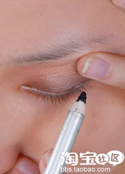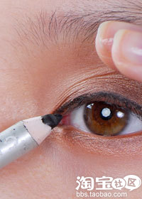 稍稍提拉眼皮露出眼头位置,顺着眼头的弧度,用眼线笔稍微勾勒一下,也可适当延伸出一点,会使眼睛看起来长一些。