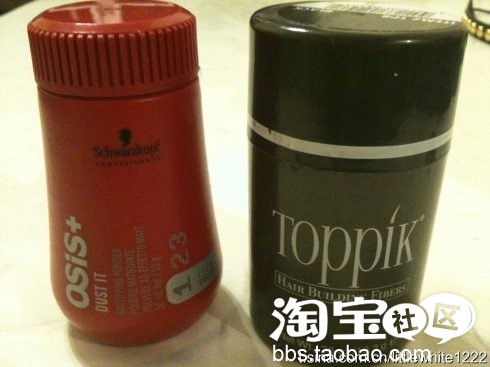 紅色的叫"鹽粉"洗凈頭髮吹乾後,灑到頭髮上會令頭髮(手感及看似)粗散,感覺頭髮豐厚很多!黑色"黒髮纖維,針對部位使用,例如頭頂(介位)稀疏,灑上會看到增多(假)髮絲,減少該位置反光!