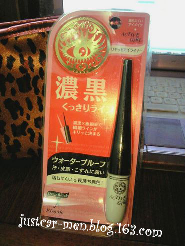 对了,我的秘密武器就是它了,KISS ME的浓黑眼线液,这眼线液真的是十分好用,特别是对于我们单眼皮和内双的女生哦,应该很多女生都知道,如果是用一般的眼线笔的话,因为没有双眼皮的缘故,就算画了眼线也看不见,或者会晕得厉害,眨一眨眼就有可能晕到下眼皮去了,变了恐怖的熊猫眼了,再美的妆也都被弄花了~!
