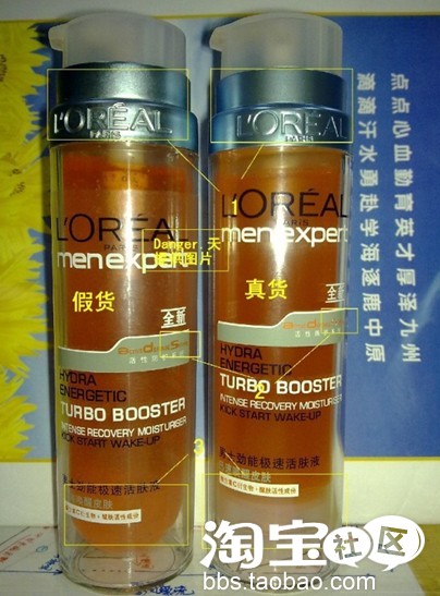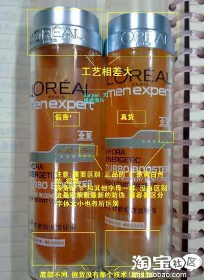 首先,左边是假货,右边是专柜正品,好笑吧,里面管子的颜色都弄反了,而且闪光灯下瓶身红色的地方的颜色也不一样,一个是反黄色的光,一个是白色。