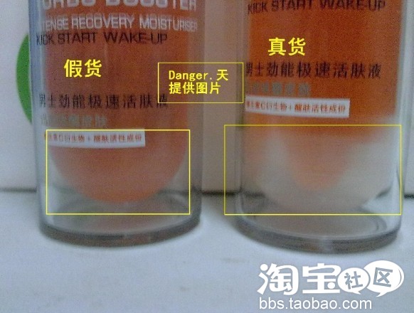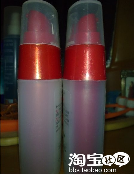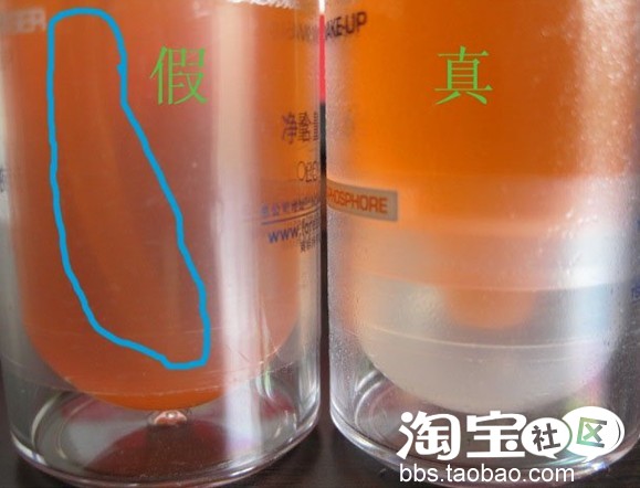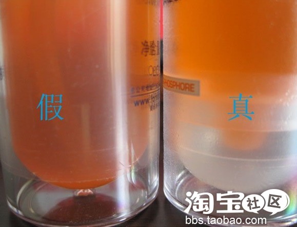 瓶子的透明度,左边正品的与右边假货的相比,假货比较透明,其实大家看照片的时候,看他的红色部分发黄光的就是正品的!