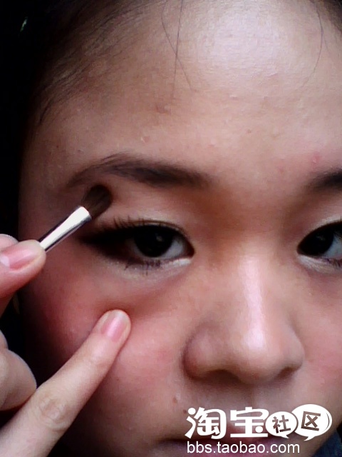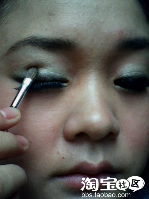 用米白色在眼下画一条,很多MM都用银白色,那样更闪亮,我没有,只好将就一下了