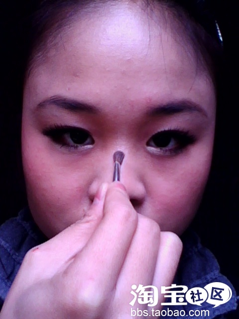 从太阳穴往颧骨扫,打在笑肌上,不会画的MM可以笑一下,然后扫在鼓起来的肉肉上。记得要晕染开。