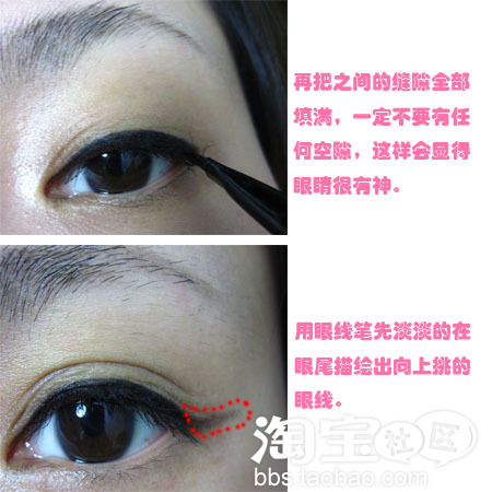也许有MM说不会画眼尾上挑的角度,所以就一定要先用眼线笔浅浅的勾勒一次,