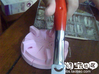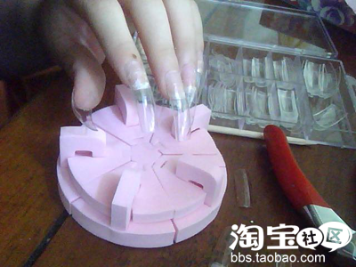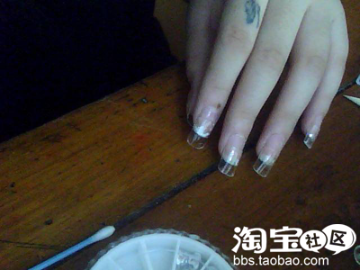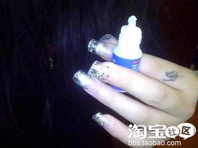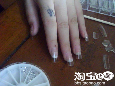 接下来就用到胶水啦,倒点胶水在甲片上,然后对准自己的手指贴上去,轻轻的按几分钟,好让甲片完全贴在指甲上,就不会有气泡咯。