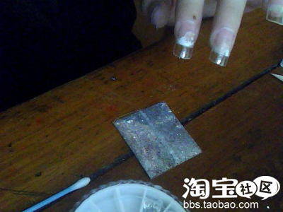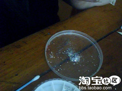我买的是一小包,所以就倒一点点到一个小盒子里,粘亮粉的时候你可以用棉签哦,这样方便很多
