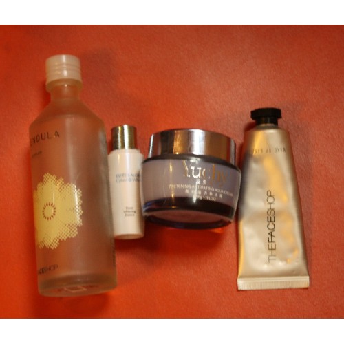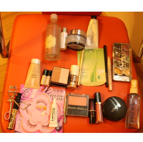 彩妆:露华浓的粉底液 贝妃玲的moon beam月光修飾液贝妃玲遮瑕棒贝妃玲的雙色修容粉 贝妃玲的high beam高光修饰液火烈鸟的眉笔透气隐形双眼皮帖BOBBL BROWN的眼线笔+白色珠光眼线笔 TAta的眼影 睫毛夹 资生堂恋爱魔镜睫毛膏 樱姿娜的假睫毛 艾家Lashgrip的假睫毛胶水 眉钳 露华浓腮红 Greamymatte lip rouge露华浓的唇彩露华浓的散粉 喷头发的是自来水