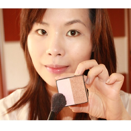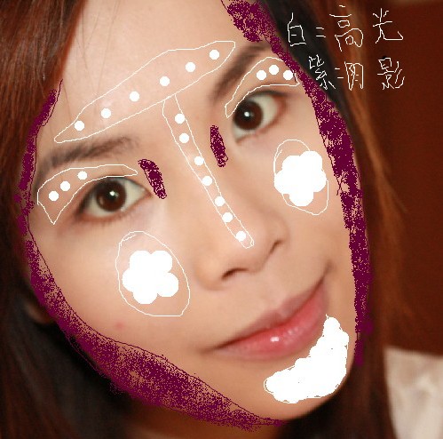 高光色是一种明亮色,涂抹的位置是脸部最突出或不该凹陷的部位,比如t字部位,下巴,眉骨,额骨,脸颊等位置,可用眼影刷或手指,按照高光图使用哦!要注意的是:高光一定要薄,不能涂抹太厚.