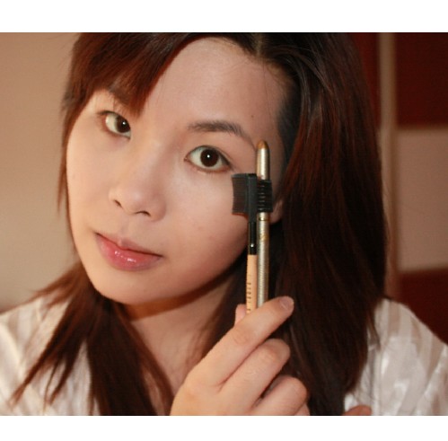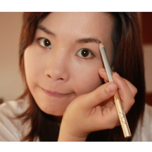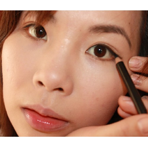 技巧:将沿线比点在睫毛根部的上方,从眼角内侧开始勾画。具体位置就是最外侧的睫毛生长的地方,从这里开始小幅移动着眼线笔,一点一店的描向眼角。眼角附近的眼际,因为隐藏在眼皮深处,所以很难画到。这时候应该稍向斜上方提起眼角,贤者鼻梁水平勾勒眼线。因为松开手后这部分又会隐藏在眼皮下,所以画得稍微粗一点也不要紧。提示:好像要填补睫毛内侧的空隙般进行描画就可以了。(MOONMOON的下眼线,是黑色眼线笔与白色眼线笔的结合哦,呵呵~~)。