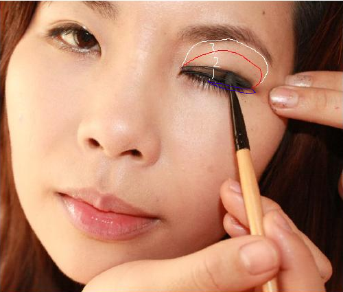 用黑色眼影在图示蓝色部分涂抹一次,在图示黑色1部分抹两三次,然后晕染到图示2部分,然后在图示3部分涂上提亮的烛光白色。两只眼睛都是同样的画法哦!呵呵~