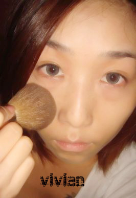 胭脂方面,稍微加深一点,用偏咖啡颜色腮红,斜扫脸颊。注意,在涂腮红的时候,建议最好微笑着,让脸蛋突出,再定位涂画,效果会加倍!(我忽略啦忘记拍了)