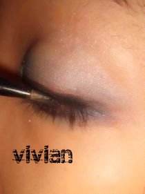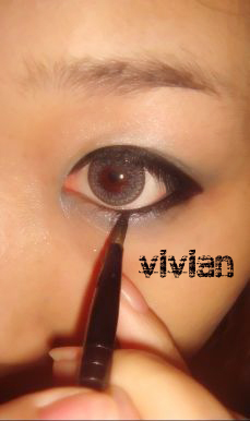 注意,在化稍浓眼妆时,眼尾画成一个“V”字型,更感迷人,尽量拉长一点。再用细眼线笔涂画内眼线。