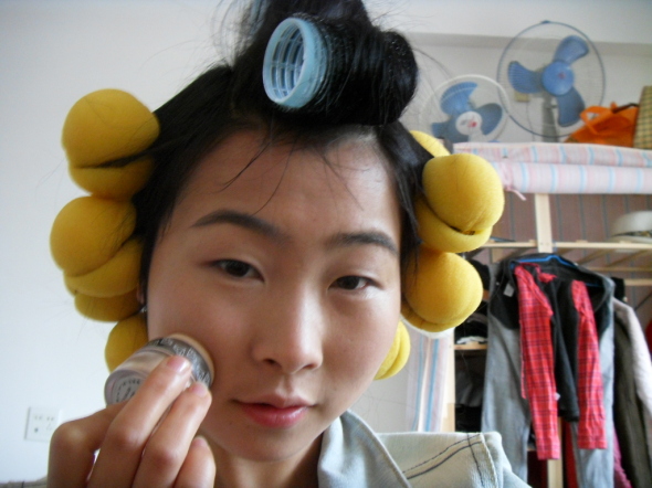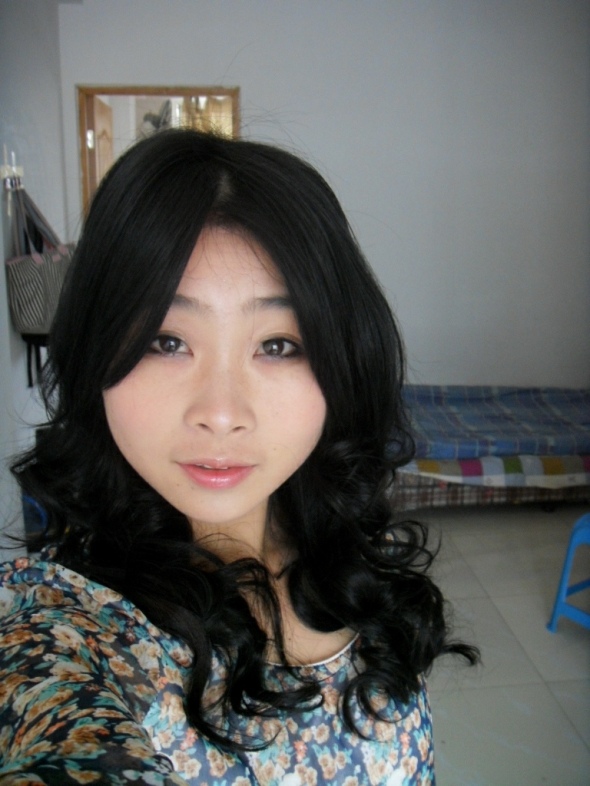 这种妆系,琼琼觉得配卷发好看。所以化妆前琼琼就做卷发啦)呵呵。本人是觉得挺好的。(有点自恋啦。大家别见怪哦)