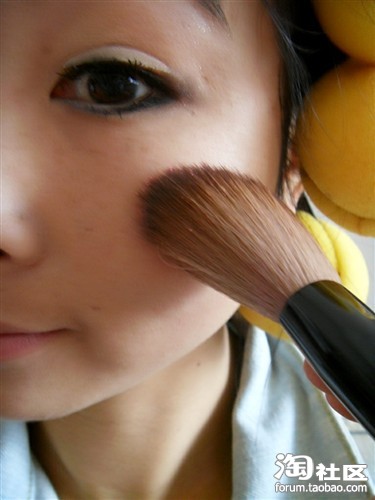 眼妆化好了,上腮红,做微笑状从笑肌斜着往太阳穴的方向刷