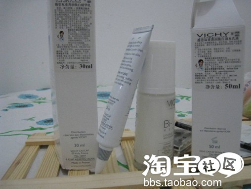 先上锁水乳和精华。呜呜呜,这两样宝贝就将近五百米。这可是来自同仁堂大药房的薇姿,第一次买这么好的东西,咱的脸终于金贵了。这款精华和锁水乳液是同事推荐的。她的脸颊因为戴眼镜,所以有两处色斑,但是用了薇姿双重菁润焕白精华乳一年后,色斑几乎看不出来了,所以,俺咬咬牙,败回来,为了深度拯救咱这张被生活重度摧残的脸。本来还想败一支双重菁润焕白修护眼霜的,当时在柜台试用,感觉非常好用,眼部非常舒服,可惜柜台小姐说,双重菁润系列的宝贝不全了,许多货脱销了,俺连日霜都木有买到。唉,小姐说下午就有货,可是偶下午有事哦。