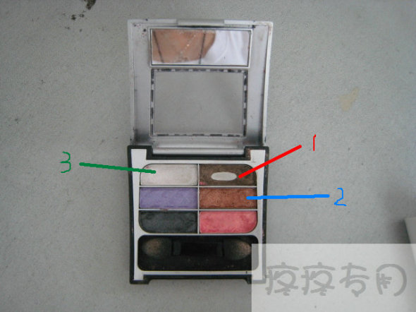 大家按照图片上的颜色区分,1号画在红色区域,2号画在蓝色区域,3号画在绿色区域.这是我最喜欢的画法,这样画出来的眼影不会太夸张,但是却又很好看,还有点渐变的效果,嘎嘎~~上效果图