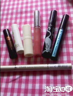 唇膏类:红色的是自然堂的唇彩,上色后很自然哟。粉粉亮亮。后面三支都曼秀雷敦的护唇膏,米色的保湿效果不错。黑色是男生用的,买给LG用的,他一次也没用。伤心。白色滴是防晒唇膏,带薄荷的,防晒效果还不错。