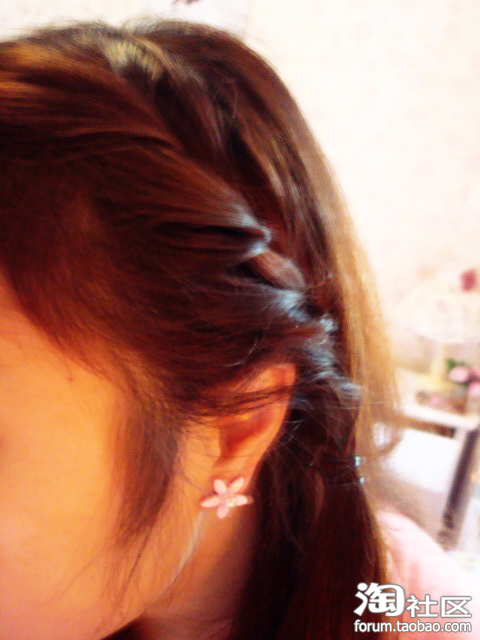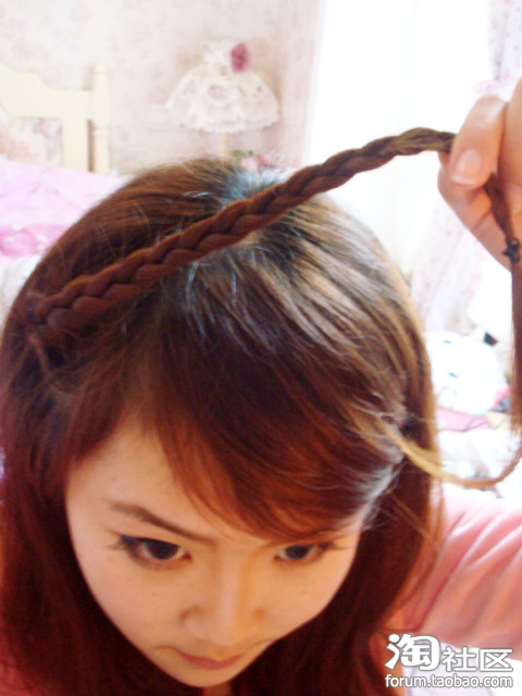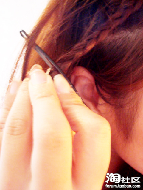 将三股辫的末端放在右侧刘海上并用卡子固定