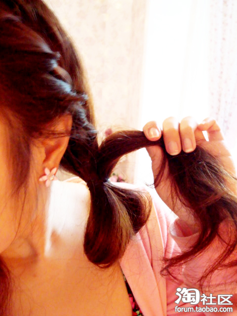 在低的位置将束起的头发分别打圈拧成丸子发髻固定