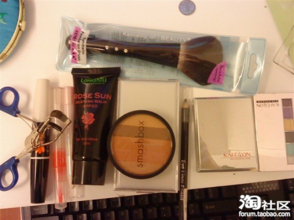 SANA的夹睫毛器,VOV的睫毛膏,忘记什么唇彩了,露韩饰的玫瑰BB 霜,SMASHBOX的修容粉,卡芙兰的粉饼,没牌子的眼线笔,卡芙兰的腮红和眼影