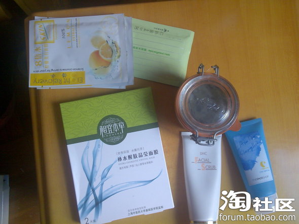 上面黄色的是唯美嘉露。。好像是柠檬美白。。我已经很白了。。对美白没看出来。。。它旁边的美丽日记的。。。这个还不错。。比较喜欢。。买了一盒只剩下一片了。。准备再去买。。相宜本草是室友推荐的。。我觉得还是可以的。。再旁边是DHC的磨砂膏。。。不好用啦。。我皮薄。。一个月我才用一次。。搓着有点痛。。后来只用来搓搓鼻子部位。。再旁边是TFS的。。睡眠面膜。。。不怎么喜欢。。。准备扔了。。那个用了。。第2天油。。但是能揉出水。。还是很好玩的。。还有个是贝佳斯的绿泥。。很多人说好用。。我是贪它能清洁毛孔。。就是敷的时候。。有点刺痛感。。哎。。。我是两个月星期才用一次的。。。