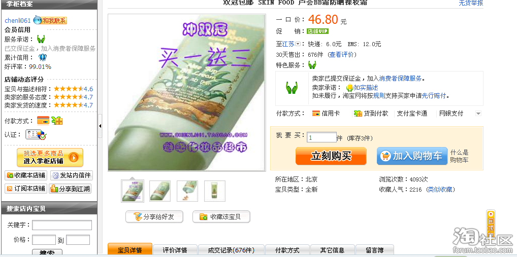 先来几张 两个店铺的截图,大家看好了,还有就是这个BB霜的韩币价格是9900 现在的汇率是0。0062 折扣人民币是61元。算他能拿到折扣,还要加上国际国内运费。最少也得50元左右。还要开上点一下就要1到2元的直通车费用。汗颜 中。。但愿这不是假货,
