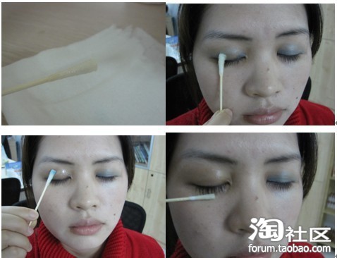 因为用过睫毛膏,所以要用棉签粘点卸妆油轻轻擦拭眼皮及睫毛根部