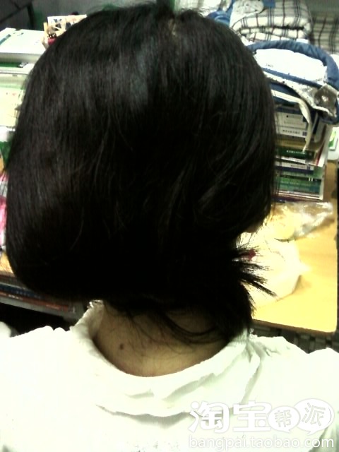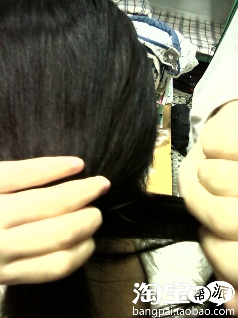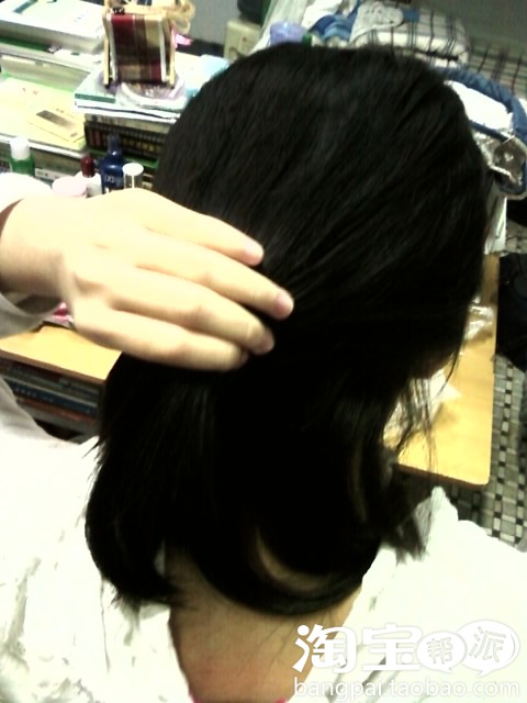 二,开始咯哈,先把头发分3层,耳朵上部是一层,中部一层,下面一层,将第一层用皮筋绑住或鱼嘴夹夹住,就是不让它打扰我们下部的工作哦~~