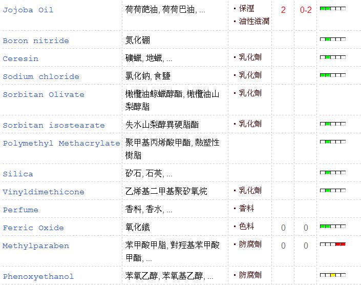 3.适合于油性肌肤使用:二氧化钛的作用及含量使这款产品控制油脂性的功能比较好,因而适合油性肌肤使用。