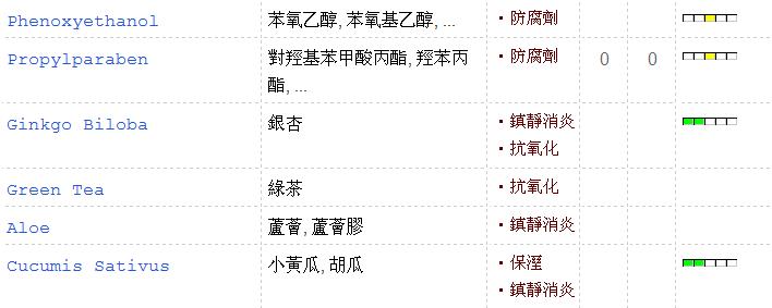 (2)芦荟:廣泛被使用於肌膚刀傷、燙傷及多種過敏現象,可有效舒緩肌膚的不適,在臨床實驗上被證實具有許多療效,包括抑制細菌生長、防止發炎、增加傷口癒合速度及修補肌膚組織等,其含有許多功效需待醫學上更進一步發掘與實驗。可降低皮膚在洗臉過程中,因皮膚障壁功能不佳而可能引起的傷害,為抗敏成份之一