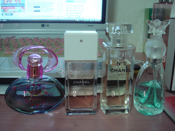 (1)我买了好久,一直不知道他的中文名字,知道的MM可以教我,意大利的牌子(2)香奈儿COCO,大爱(3)香奈儿5号淡香(2)(3)两瓶香水是我的最爱,不亏是大牌)(4)安娜苏的许愿精灵,适合夏天用,我不这么用,闻多了这香味想吐,好久没用了。香奈儿两瓶是大爱