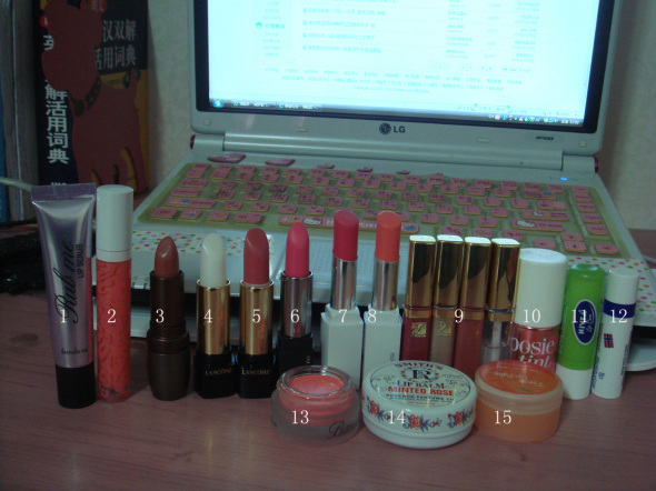 (1)banila co.的唇部去角质(2)banila co.唇彩(3)skinfood(4)兰蔻(护唇)防唇吻,用着不错(5)兰蔻(6)(7)(8)三个都是banila co.的(9)四支都是雅诗兰黛的,本来就六支,是09年圣诞节的限量的,还有两只因为颜色老,给我老妈了(10)大家应该非常熟悉了(11)妮维雅(12)露得清(13)banila co.(14)smith's很好用,涂上去凉凉的(15)thefaceshop买了好久了,还没用光