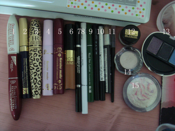 (1)欧莱雅睫毛膏,热水就可以卸掉,很好用,很方便(2)雅诗兰黛的睫毛膏,很好用,也很容易卸掉(3)HR的豹纹睫毛膏,油脂比较多的,还有内双MM不是很适合,会晕,也不是很好卸,反正没传说中的好,(4)(5)是一套的,KISSME的睫毛膏,(4)是卸的,如果不用他专用的卸的话,根本卸不掉,很好用,不晕染,碰到水也不会掉,大爱(6)CANMAKEd 眉刷(7)爱丽的眉笔将就用着(8)爱丽的白色笔,下眼线提亮(9)VOV的眼线,不这么好用(10)KATE的眼线,超级好用,不会晕,油脂比较多,内双MM都OK,去大海里游泳都没关系(11)CANMAKE的眼影,不这么用眼影,买别的东西的时候送的(12)KISSME的眼线胶,很好用,(13)MISSHA的眼影,不这么红啊用(14)爱丽的眼影,不这么太用(15)是韩国的一个牌子,高光提亮,