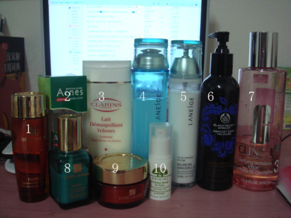 (1)雅诗兰黛的红石榴水,对我貌似没什么用。(2)曼秀雷敦的抗痘爽肤水,感觉还行,已经用了不下10瓶。(3)娇韵诗的吸盘。用着还行,就是要按摩太久,好麻烦。(3)(4)是兰芝的水和乳,感觉没什么用,随便用着(6)THEBODYSHOP的身体乳,发亮的,买错了,适合PART,平时用不着(7)倩碧的三部曲三号水,凑合着用着,拿来敷脸.(8)雅诗兰黛的修复毛孔的,死贵,还没用.(9)雅诗兰黛的红石榴晚霜 (10)品木宣言的眼霜,冬天用很适合