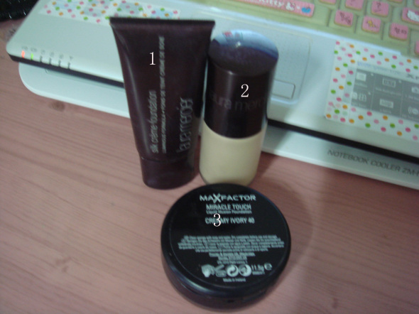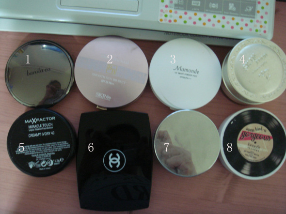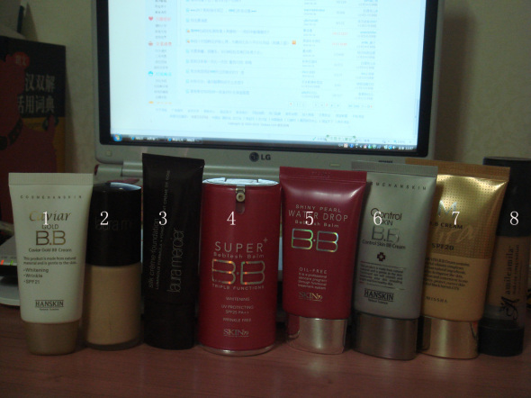 (1)HANSKIN冬天用比较保湿,太白,不太适合黑的MM(2)laura mercier的保湿粉底液,适合冬天用遮盖力很好(3)laura mercier的粉底液,遮盖力很好,适合夏天用(4)SKIN79的BB很不错,遮盖力很好(5)SKIN79的美白保湿BB,有亮亮的东西,不这么喜欢用(6)HANSKIN的痘痘专用BB,很好用,对痘痘肌肤的人很适合(7)MISSHA的金色BB,买了好久了,一直不这么喜欢用,太白(8)什么牌子忘记了,我拿他来做阴影的